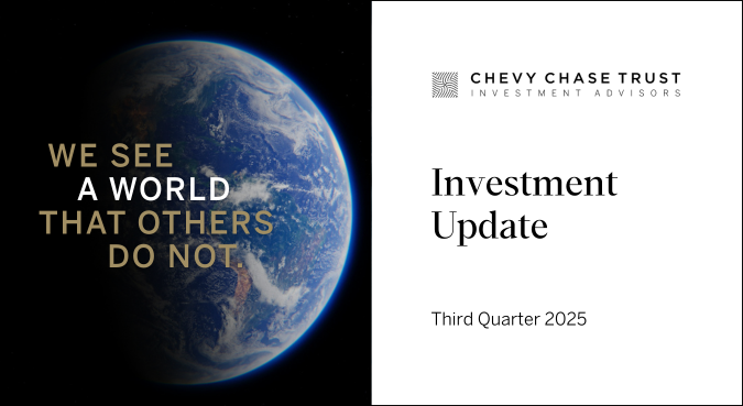 Important Disclosures This commentary is for informational purposes only. The information set forth herein is of a general nature and does not address the circumstances of any particular individual or entity. You should not construe any information herein as legal, tax, investment, financial or other advice. Nothing contained herein constitutes a solicitation, recommendation, endorsement, or offer to buy or sell any securities or other financial instruments. This commentary includes forward-looking statements, and actual results could differ materially from the views expressed. Materials referenced that were published by outside sources are included for informational purposes only. These sources contain facts and statistics quoted that appear to be reliable, but they may be incomplete or condensed and we do not guarantee their accuracy. Fact and circumstances may be materially different between the time of publication and the present time. Clients with different investment objectives, allocation targets, tax considerations, brokers, account sizes, historical basis in the applicable securities or other considerations will typically be subject to differing investment allocation decisions, including the timing of purchases and sales of specific securities, all of which cause clients to achieve different investment returns. Past performance is not indicative of future results, and there can be no assurance that the future performance of any specific investment or investment strategy will be profitable, equal any historical performance level(s), be suitable for the portfolio or individual situation of any particular client, or otherwise prove successful. Investing involves risks, including the risk of loss of principal. The level of risk in a client’s portfolio will correspond to the risks of the underlying securities or other assets, which may decrease, sometimes rapidly or unpredictably, due to real or perceived adverse economic, political, or regulatory conditions, recessions, inflation, changes in interest or currency rates, lack of liquidity in the bond markets, the spread of infectious illness or other public health issues, armed conflict, trade disputes, sanctions or other government actions, or other general market conditions or factors. Actively managed portfolios are subject to management risk, which involves the chance that security selection or focus on securities in a particular style, market sector or group of companies will cause a portfolio to incur losses or underperform relative to benchmarks or other portfolios with similar investment objectives. Foreign investing involves special risks, including the potential for greater volatility and political, economic and currency risks. Please refer to Chevy Chase Trust’s Form ADV Part 2 Brochure, a copy of which is available upon request, for a more detailed description of the risks associated with Chevy Chase Trust’s investment strategy. The recipient assumes sole responsibility of evaluating the merits and risks associated with the use of any information herein before making any decisions based on such information.